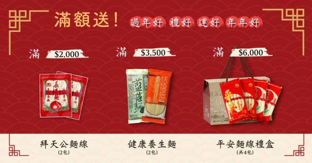 ◆新春滿額送◆禮好。運好。年年好 活動 : 享滿額禮、滿$2000 送拜天公麵線2包;滿$3500 送健康養生麵;滿$6000 送平安麵線禮盒。