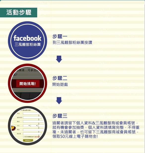 即日起只要你是三風麵館商城會員,並參加本活動,就有機會獲得豐富好禮喔!另外,不管過關或失敗,只要留下三風麵館商城會員帳號,即可獲得現上商城電子購物金50元!(於48hr內匯入電子購物金)*本活動獲獎商品於活動結束後統一寄出。