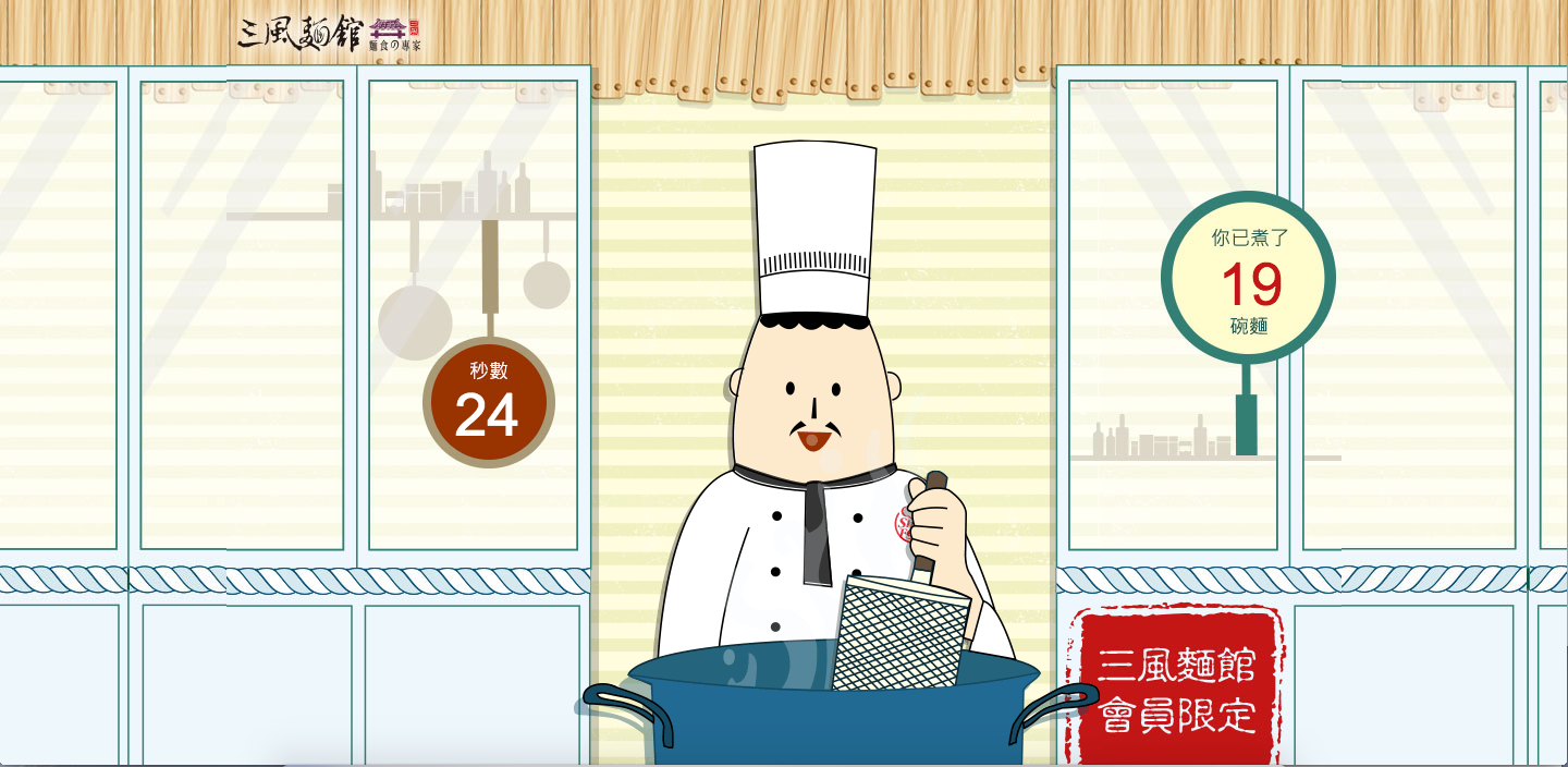 你是料理廚神嗎 ? 你喜歡煮麵嗎 ? 你愛玩遊戲嗎 ? 只要在40秒內煮超過50碗麵,你就是料理廚神!!還能與其他網友搶高額購物金!!還不趕快來挑戰 ? 三風麵館林師傅除了會製麵,煮麵也難不倒,40秒內煮了121碗麵,你敢來挑戰林師傅嗎 ?