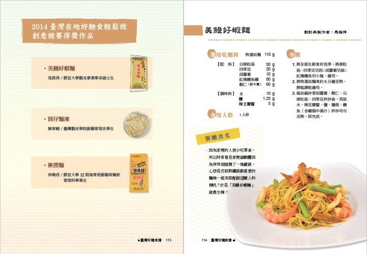台灣好麵二十四節氣食譜首先從「風評好」的臺灣小麥地圖到臺灣好麵地圖,依循此脈絡加以彙整後,隨即以 MIT 麵條展開「風味佳」之臺灣好麵菜單設計與食譜研發。最後,「風行全球」除了閱讀風之外,並記載串聯產、官、學資源所執行的價值共創案例,將具有臺灣特色的麵食文化呈現於世人眼前,期待大家能按圖索驥,深入淺出地探索台灣麵食文化的特色。