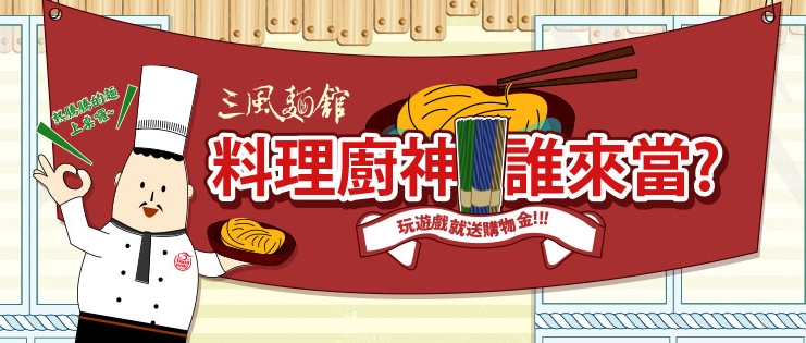 你是料理廚神嗎 ? 你喜歡煮麵嗎 ? 你愛玩遊戲嗎 ? 只要在40秒內煮超過50碗麵,你就是料理廚神!!還能與其他網友搶高額購物金!!還不趕快來挑戰 ? 三風麵館林師傅除了會製麵,煮麵也難不倒,40秒內煮了121碗麵,你敢來挑戰林師傅嗎 ?
