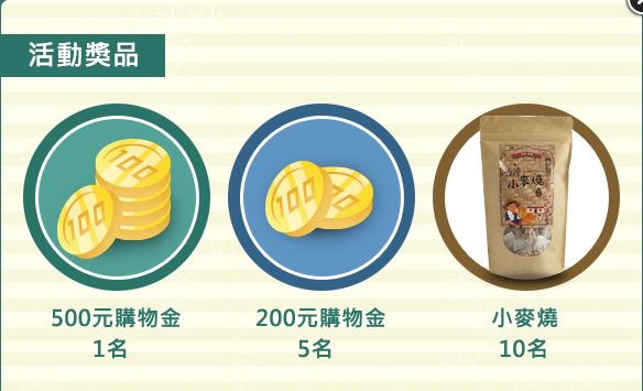 ♛500元購物金1名、200元購物金5名、小麥燒10名