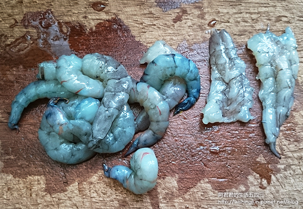 ▲這次蝦蝦用了白蝦和草蝦兩種,去腸泥厚切平。