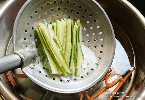 ▲接著就陸續把食材川燙,小黃瓜燙過去生味,紅蘿蔔絲可以燙到熟比較好入口,燙過的食材馬上就用冰水降溫,可以讓小黃瓜保持清脆不變黃。