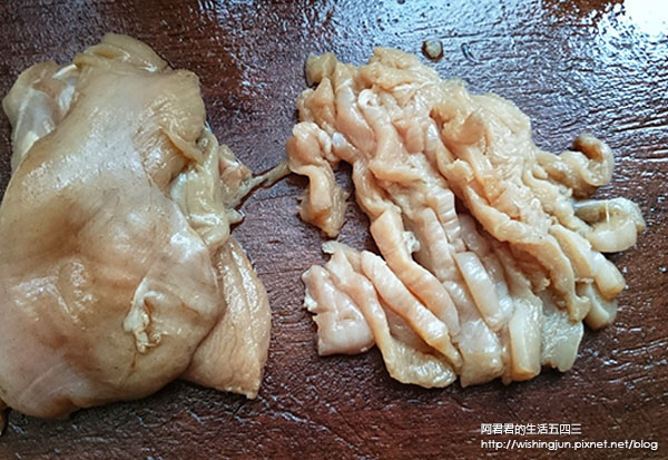 ▲雞胸肉先用醬油、蒜頭、胡椒醃入味後切絲。