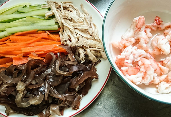 為了節約水資源,建議大家用一鍋水來完成所有食材的川燙,川燙的順序為:蔬菜絲→雞胸肉絲→蝦蝦。從蔬菜絲開始川燙可以讓熱水不那麼混濁,並且川燙完畢就馬上浸泡冰水,避免熱度在食材上持續加溫,食材過熟就可惜啦!