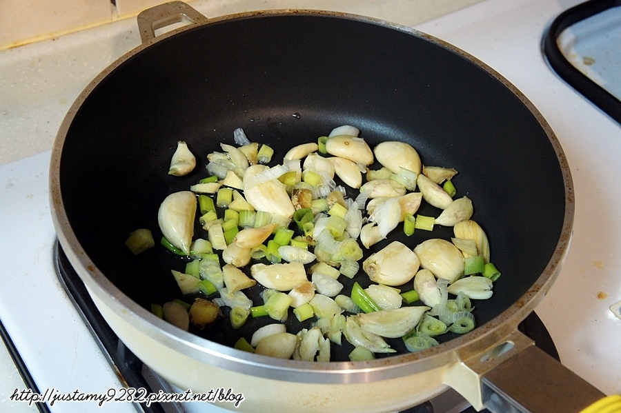 將蔥白、薑片丁、蒜頭丟入鍋中爆香