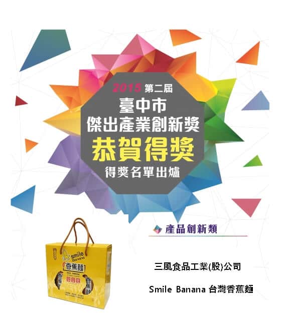 賀- 三風食品(Smile Banana 台灣香蕉麵)榮獲第二屆臺中市傑出產業創新獎