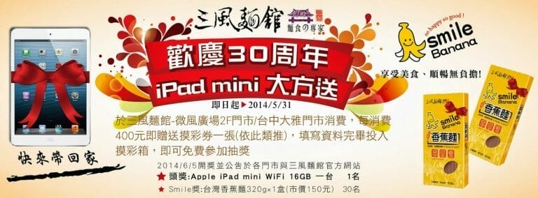 三風麵館歡慶30周年 ipad mini大方送!! …
